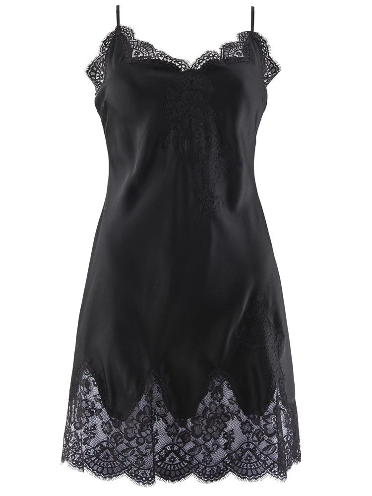 Das Negligé ist am Decolleté und zusätzlich am Saum umlaufend mit der weichen Spitze benäht. Durch die feine Verarbeitung und den körpernahen Schnitt ist dieses Modell auch als Unterkleid tragbar.